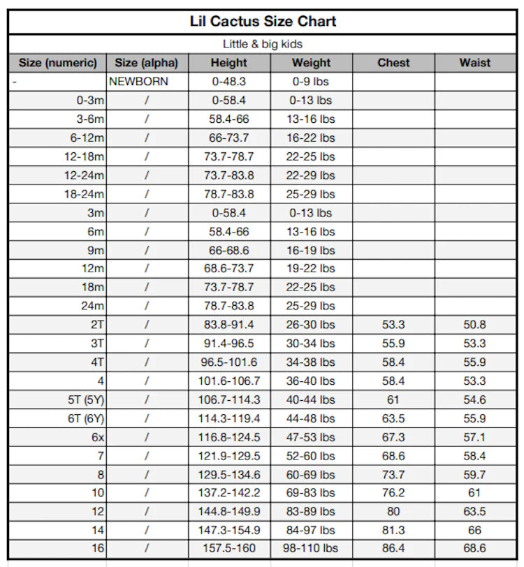 - Lil Cactus Brand— see size chart